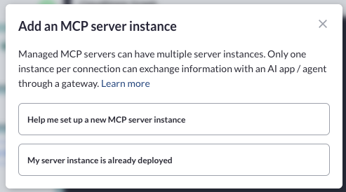 A managed server is often used to provide access to an MCP server that needs to run in a hosted environment. Sometimes though, you may want to provide different access to different users without needing to recreate the same server multiple times. For managed servers, we provide a concept of "server instances" where each instance can be connected to while making it easy to just assign a single managed server to a gateway. The key difference with server instances is that during the connection flow, a user has to select only one server instance out of many for that connection.